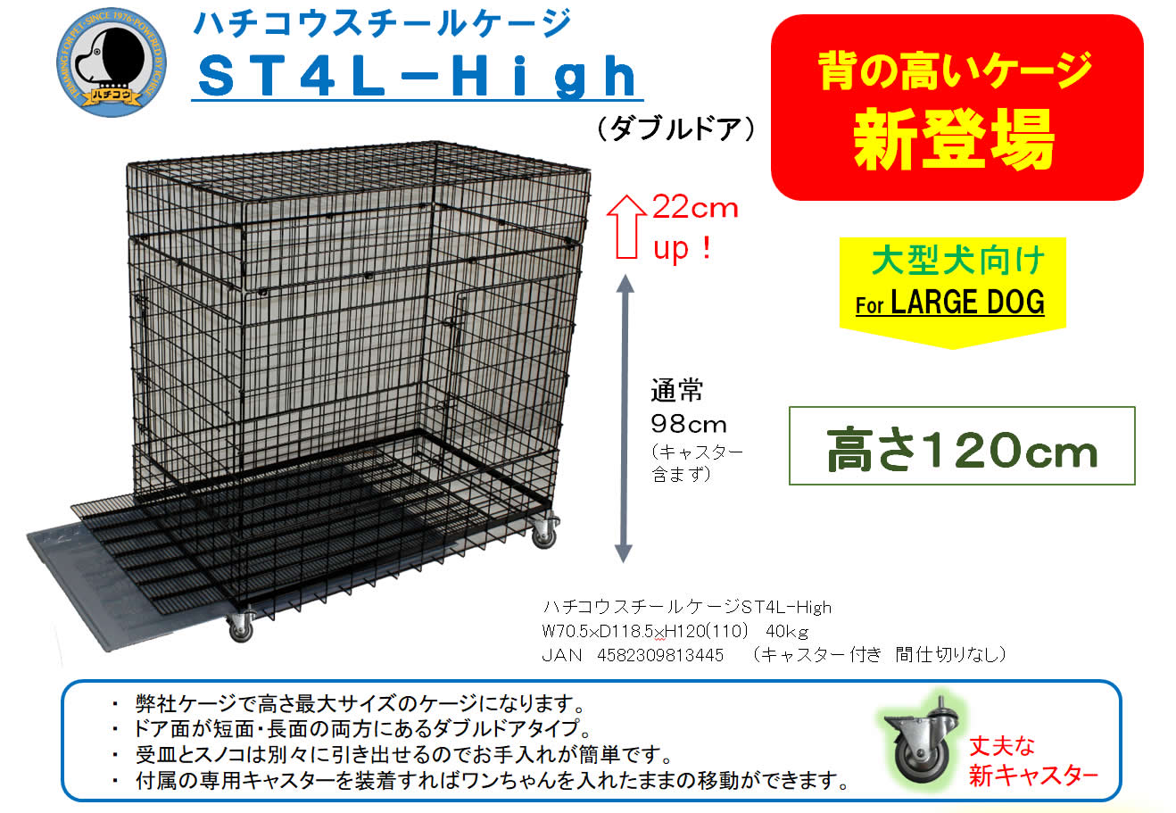 ハチコウケージ スチール 4Lダブルドア(背高) 仕切り付き ST4L-High-WOP 70.5x118.5x120【送料無料】